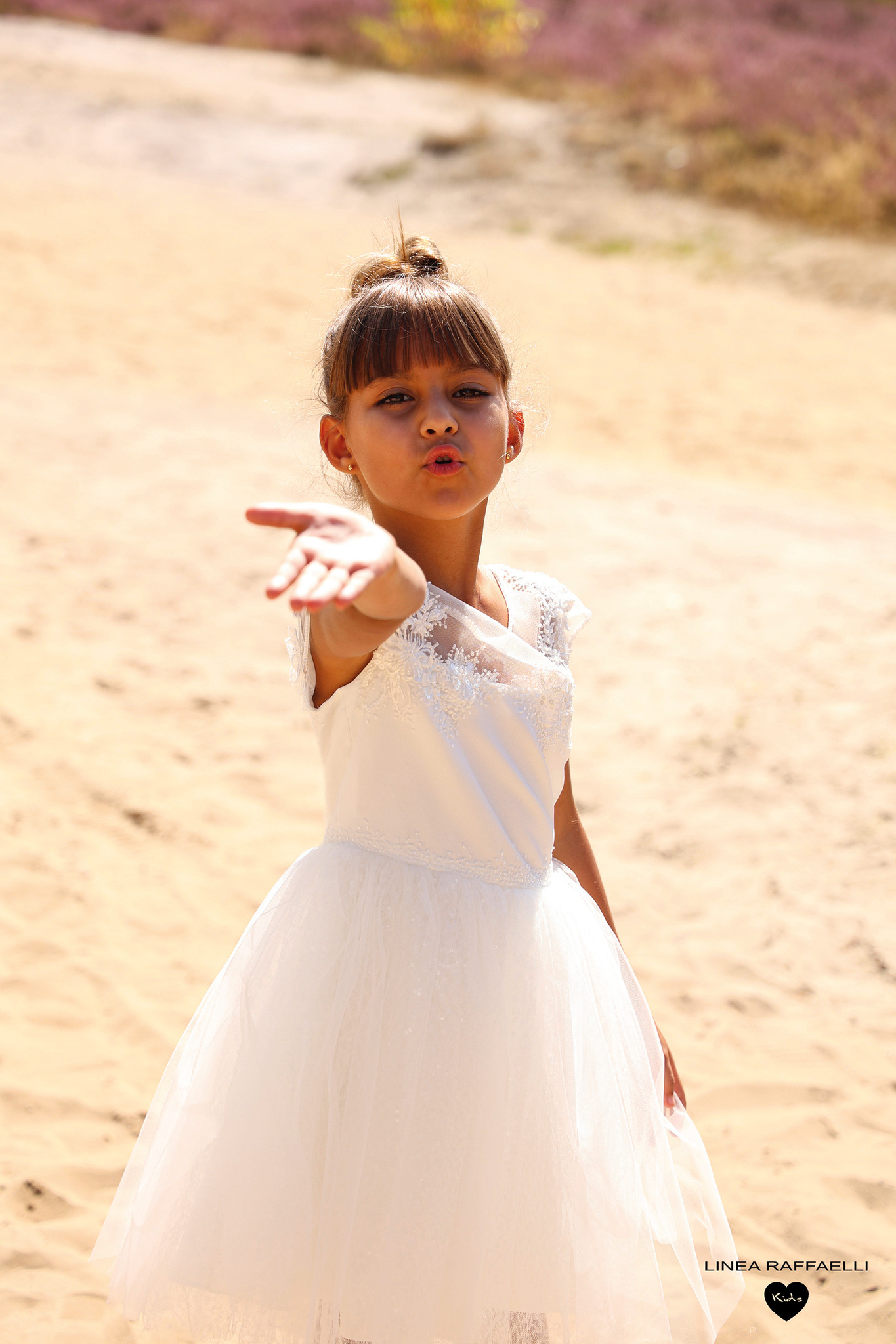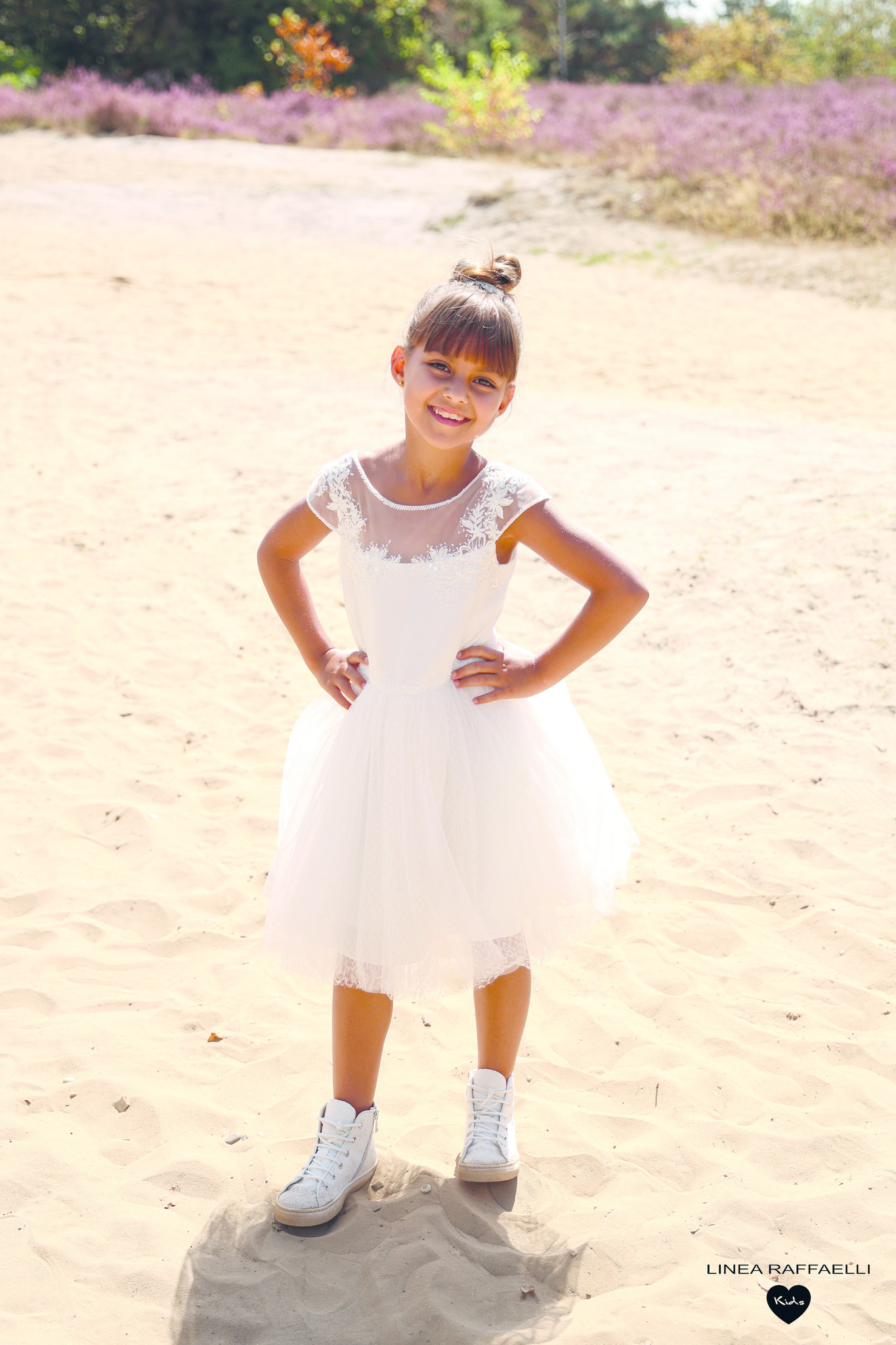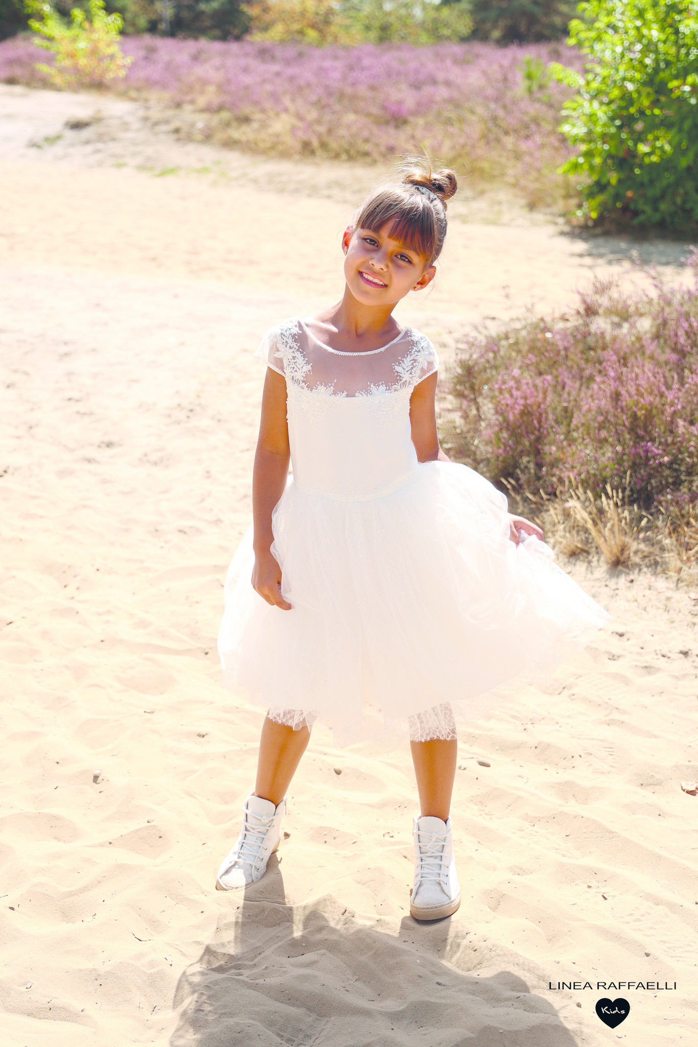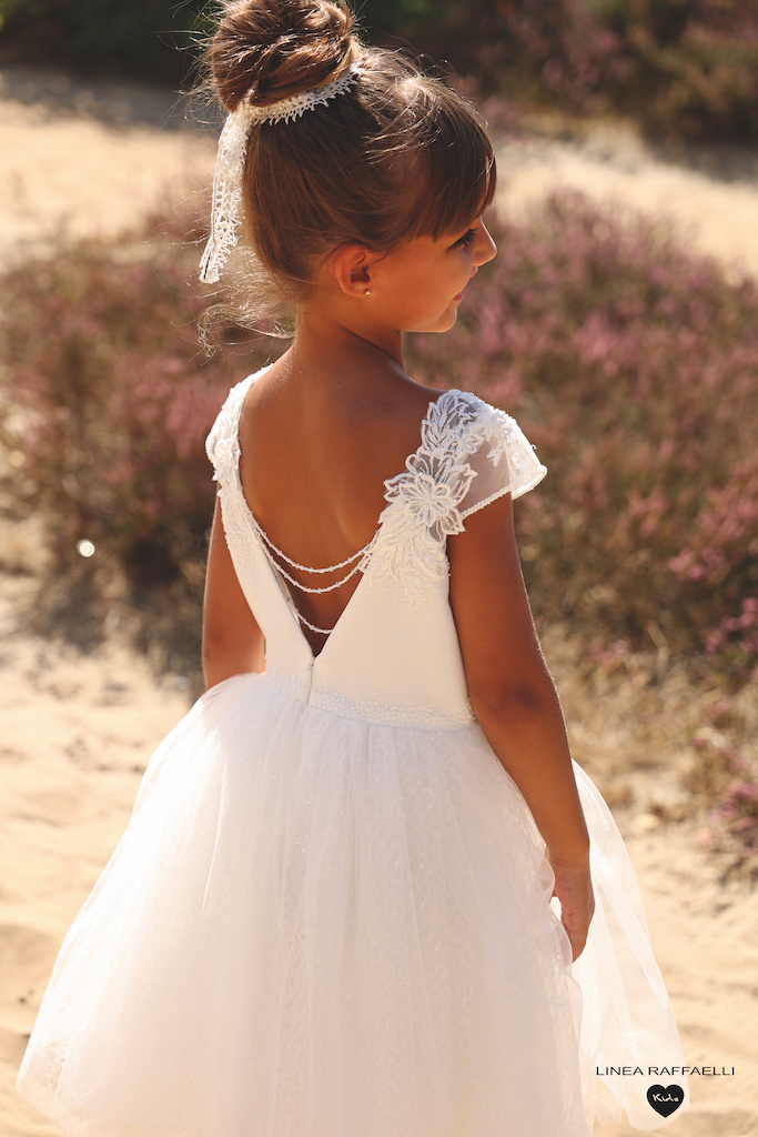 • Prachtige ecru feestjurk afgewerkt met kant, pareltjes en pajetjes in de rok.